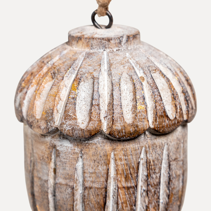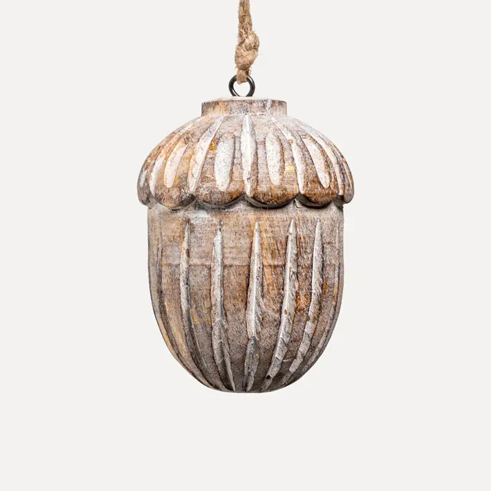 Подвес в форме желудя выполнен из дерева в светлом сером цвете, подчеркивающим спокойствие и выразительность натуральной фактуры. Лаконичная форма и природный оттенок делают подвес универсальным элементом для оформления пышных и высоких елей, декора лестниц и каминов в лесной стилистике.