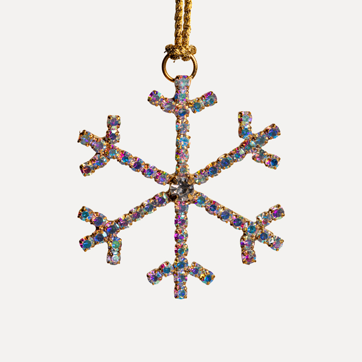 Подвес в форме снежинки, выполненный из металла в цвете золота и стеклянных кристаллов мультиколор. Камни с многогранной огранкой обеспечивают насыщенное сияние, заметно превосходящее пластиковые аналоги, а золотистая основа подчеркивает глубину и игру кристаллов.
