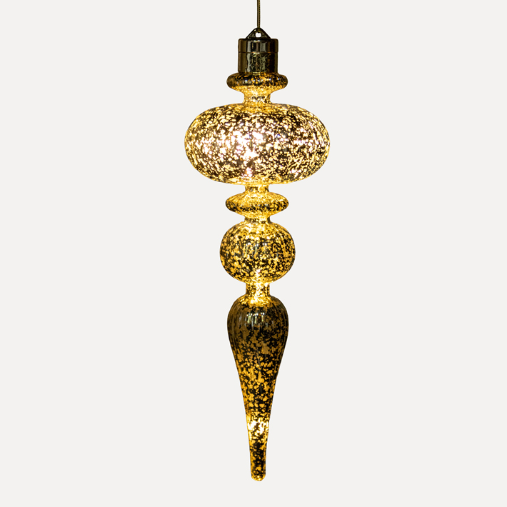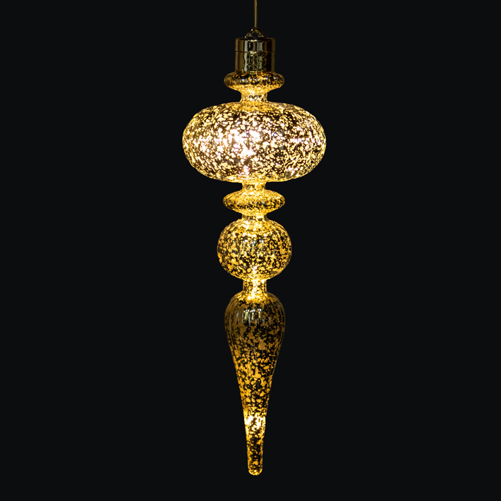 Фигурный подвес с эффектом состаренного стекла и встроенной светодиодной гирляндой создает выразительные световые акценты в оформлении. Благородный золотой оттенок гармоничен в разнообразных стилистиках и цветовых решениях. Подходит для оформления потолочных зон, создания подвесных композиций и каскадных инсталляций.