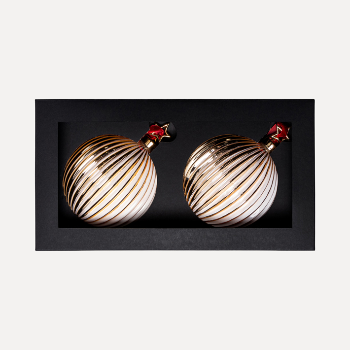 Стеклянные шары в наборе с фигурными капами — новое прочтение базовых изделий для праздничного оформления. Специально подобранные фигурные капы и бархатные ленты придают изделиям выразительность и премиальный вид.