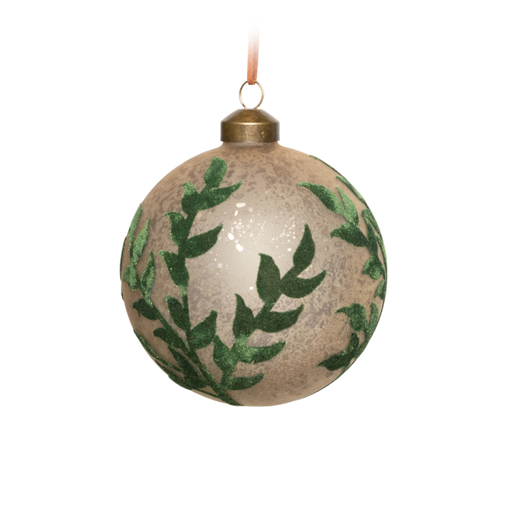 Шар ЛИСТЬЯ с бархатом D10 см, стекло, шампань, зеленый