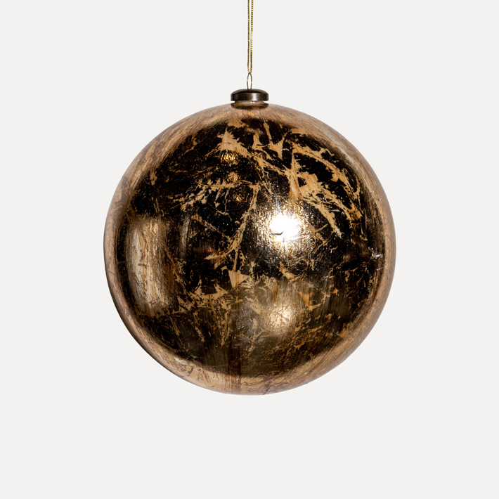 Легкое изделие из пластика в золотом цвете с имитацией фактуры состаренного лакированного дерева подходит для декора в разных стилях и цветовых решениях. Металлический кап, подобранный специально для изделия, придает ему утонченный вид. Сочетается с аналогичными шарами разных размеров и другими изделиями бренда.
