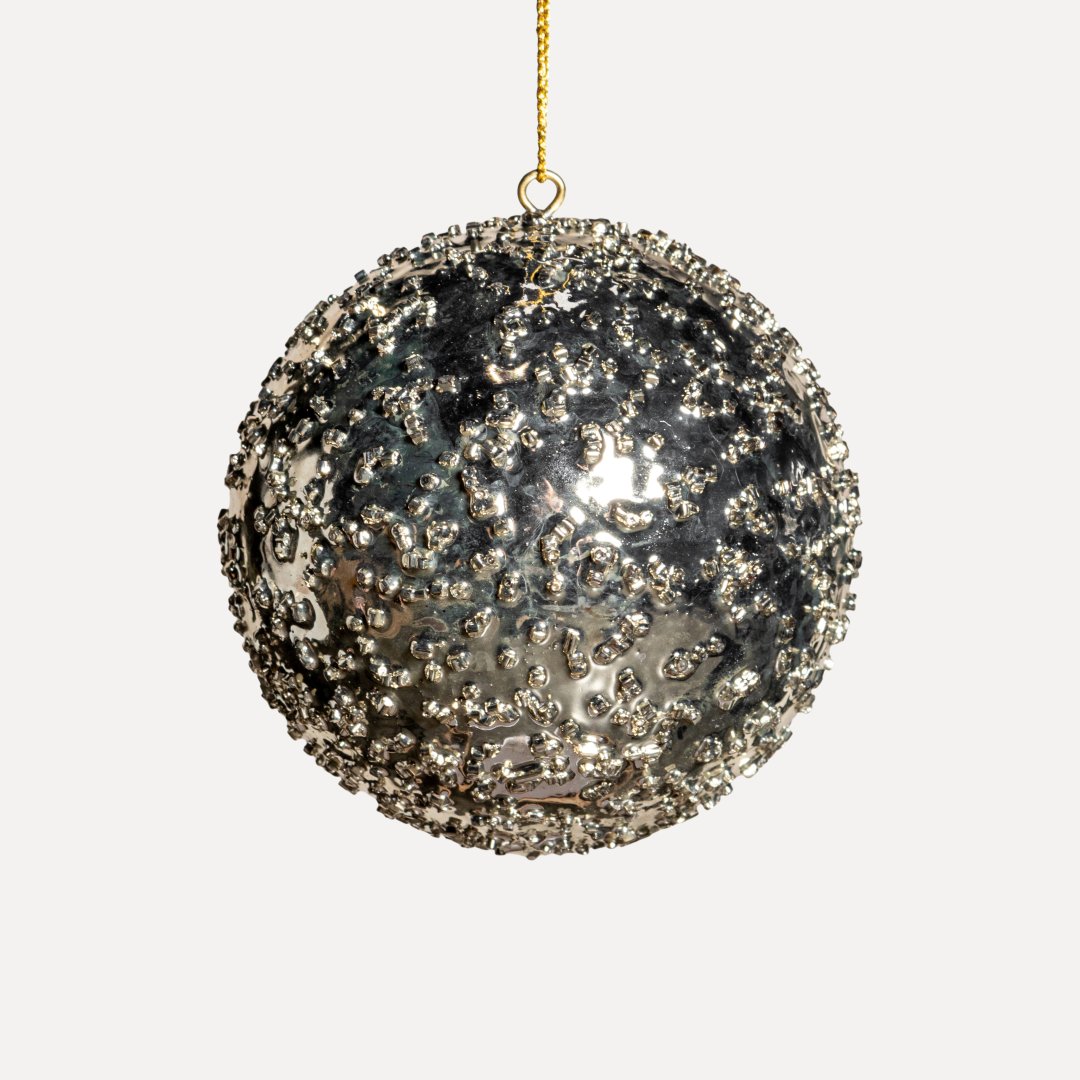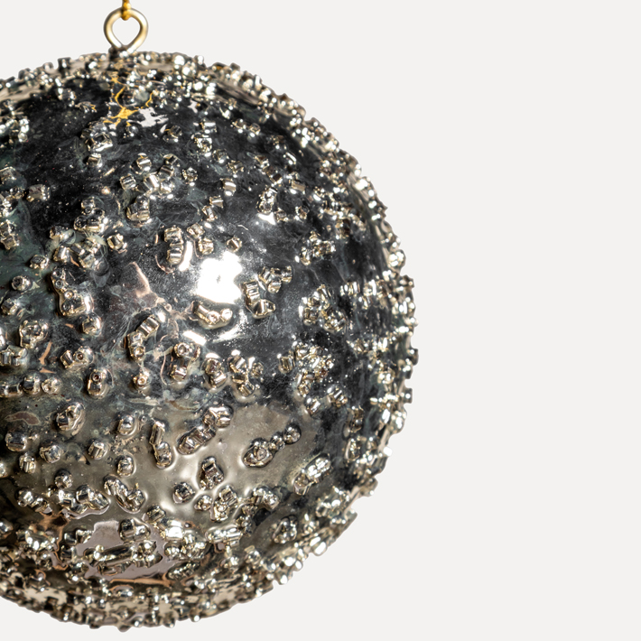 Инкрустация стклярусом создает эффект застывших капель и неоднородную фактуру, которая придает композиции дополнительное сияние. Классический оттенок шампани подходит для разнообразных декоративных и цветовых решений. Сочетается с аналогичными шарами разных размеров и другими изделиями бренда.