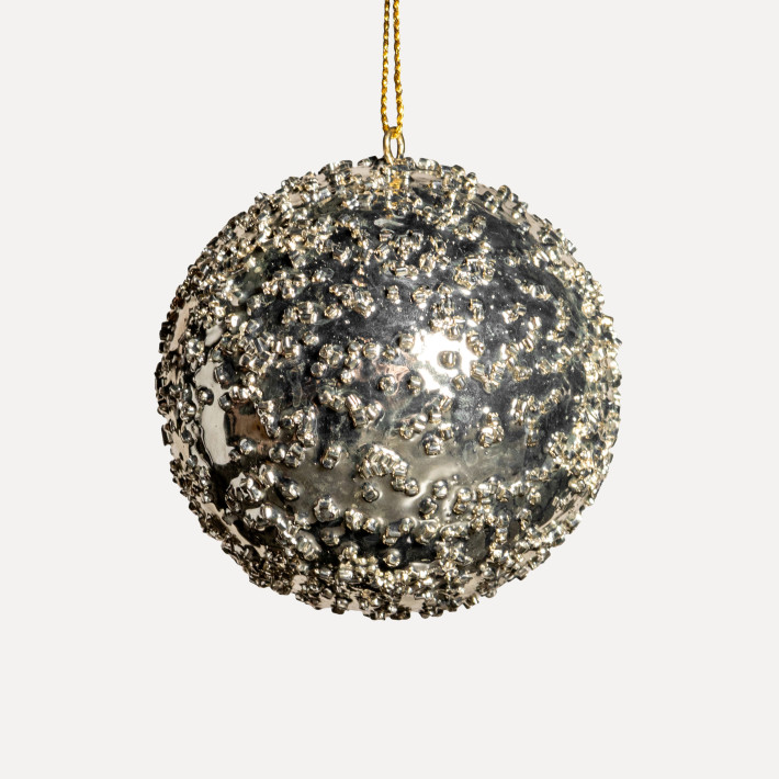 Инкрустация стклярусом создает эффект застывших капель и неоднородную фактуру, которая придает композиции дополнительное сияние. Классический оттенок шампани подходит для разнообразных декоративных и цветовых решений. Сочетается с аналогичными шарами разных размеров и другими изделиями бренда.