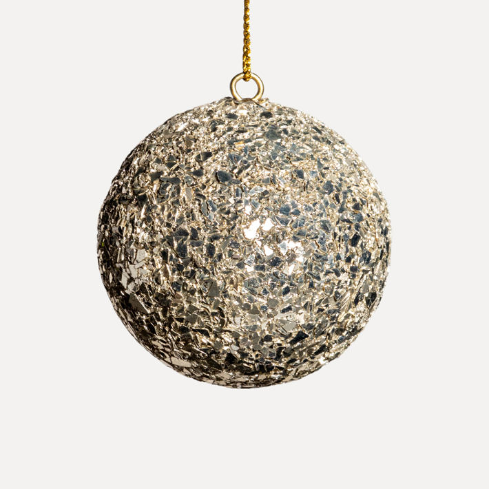 Инкрустация стклярусом создает эффект застывших капель и неоднородную фактуру, которая придает композиции дополнительное сияние. Классический оттенок шампани подходит для разнообразных декоративных и цветовых решений. Сочетается с аналогичными шарами разных размеров и другими изделиями бренда.