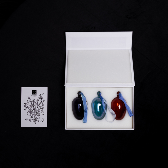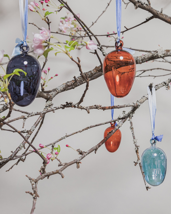 Набор из трех стеклянных подвесов ручной работы в форме яиц — выражение глубоких смыслов и дань традициям светлого праздника Пасхи. Темная палитра декоративных украшений отражает оттенки, наполняющие природу с приходом весны.