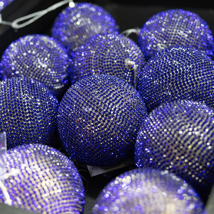 Шар с кристаллами в насыщенном синем цвете — акцентное украшение для праздничных оформлений. Стеклянные камни на серебряной металлической основе создают многогранный блеск, недостижимый для пластиковых аналогов.