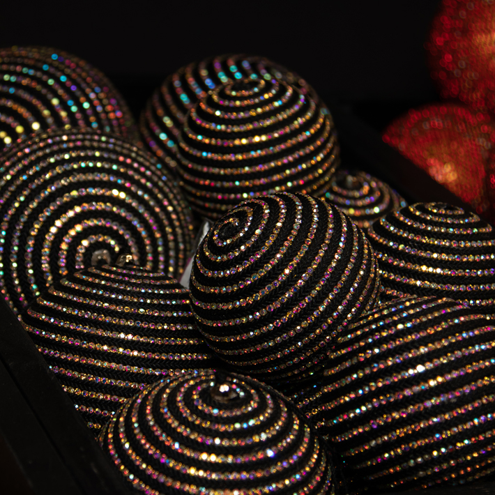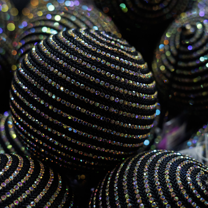 Шар с кристаллами мультиколор и текстильным шнуром в классическом черном цвете — фактурный акцент для создания праздничных оформлений. Чередование материалов придает изделию приятную тактильность. Камни с эффектом мультиблеска создают многогранное и динамичное сияние, подчеркнутое текстурой шнура.