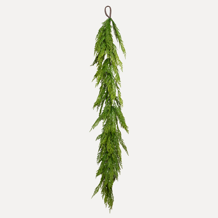 Хвойная гирлянда для оформления интерьеров частных и коммерческих пространств. Мелкая хвоя густо расположена по всей кроне изделия и образует аккуратную форму, напоминающую ветви туи.
