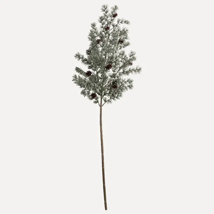 Литая хвойная ветвь с мягкими иголками средней длины, напоминающими лиственницу, для декора частных и коммерческих пространств. Небольшие полураскрытые шишки придают ветви натуралистичный вид, а припыленный оттенок хвои сочетается с заснеженной и голубой хвоей.
