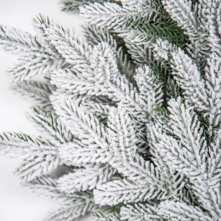 Заснеженный рождественский венок для оформления частных и коммерческих пространств. Изящная хвоя густо расположена по всей поверхности изделия. Форма венка пышная с выступающими по краям изящными веточками создает естественный вид.